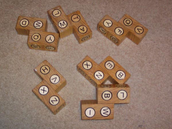 R3C74NG13The title was a cryptic reference to the phrase "Digits In A Rectangle" which, in turn, was a reference to another puzzle of mine, "Digits In A Box". Basically, the Players had 10 polyform pieces, each representing one of the ten digits (0-9), and they had to lay them flat on the table and interlock them within the smallest area rectangle possible. No team found the optimal solution, but most were able to get some positive points based on the scoring scheme presented.Where's Winslow?This proved to be the most popular puzzle of the day. I liked it very much as well (and not just because it was a very easy puzzle to 'design'). The puzzle used the giant U.S. map I have in my house. For each letter of the alphabet Players had to try to locate a city on the map the began and ended with that letter. Some of the best examples found included Huntington Beach (in California), Dauphin Island (in Alabama), and Yah-tah-hey (in New Mexico). Longer city names earned more points. I plan to post a 'best possible list' as soon as I analyze the map index fully.Cube Snake BoogieI really liked this manipulative puzzle, but, unfortunately, it was manipulated a bit too roughly in the third round of the Party and it broke. Since no team had yet solved it, I decided to just make this round a 'bye' round for Players (so technically this Party was a Nonathlon not a Decathlon, I guess).Blind Man's BluffThis is a pretty typical "Eric-Harshbarger-space-fillng-kind-of-puzzle". Players had to take 26 small rectangles based on the Braille Alphabet and place them within a rectangular playfield. As many as possible of the dots on the Braille pieces were to be aligned with black dots on the field. Bonus points were given if the perfect arrangement was found (accomplished by three of the teams).Dodecahedron