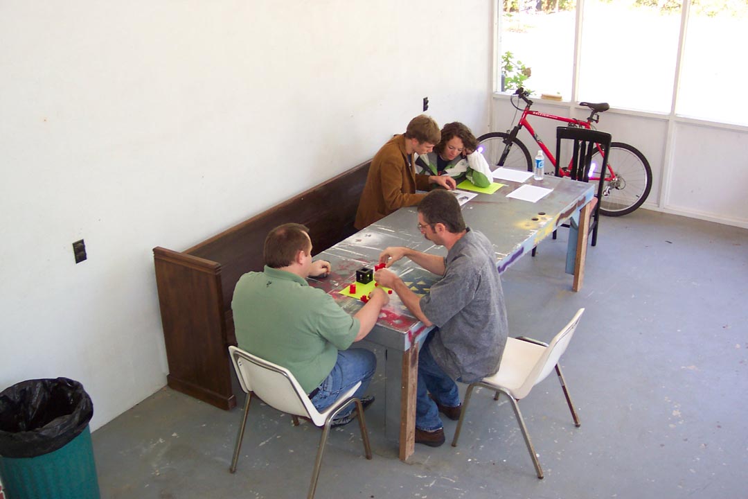 First, I goofed and accidently scheduled the Party for Easter weekend again (I did that for the first Decathlon as well). I was trying to dodge Spring Break weekends for Auburn University as well as Tax Day, and by doing so, I completely forgot about Easter again. Still, I had 22 Players participate (10 pairs on Saturday, 1 pair on Sunday), so I thank them all for attending on the holiday weekend. The next piece of insanity I had no control over whatsoever. In late March I was beginning to worry that come Party-day the weather was going to be blazing hot (our March was very warm here in Auburn). Um... no. Easter weekend managed to bring in a freak cold snap. The nights around Party-day were near freezing (literally), and the high temperatures were in the low 50s (about 30 degrees colder than the week before). Unfortunately, many of my puzzles were stationed outside, and even though it was a sunny day, warmer temperatures would have been appreciated by all. Once the party began at noontime, however, everyone jumped head first into the zaniness. A few typos were discovered in the puzzles, I accidently left out one word in a crossword-type puzzle, and in the third round one of the manipulative puzzles (was) broke(n). But, despite all of that, things moved forward, and by the end of the day everything was running smoothly. My smaller springtime decathlon parties are meant to be less taxing on me as the designer/organizer/host. and this proved to be the case again this year. I was tired by the end, but not exhausted. We started at noon, and we finished the last round at just past 5 o'clock (25 minutes per puzzles plus a five minute break in between). Pizza arrived at 5:30 and we all hung around, socialized, and I explained the tricks to solving most of the puzzles. I was very pleased with not only the variety of puzzles at this Decathlon but also how well I developed the scoring system for each challenge. It was a tight race for everyone involved (only 70 Points separated the first and last place teams), and no one really knew who was going to win until the very end. Below are brief explanations of the challenges that faced the players. The Puzzles