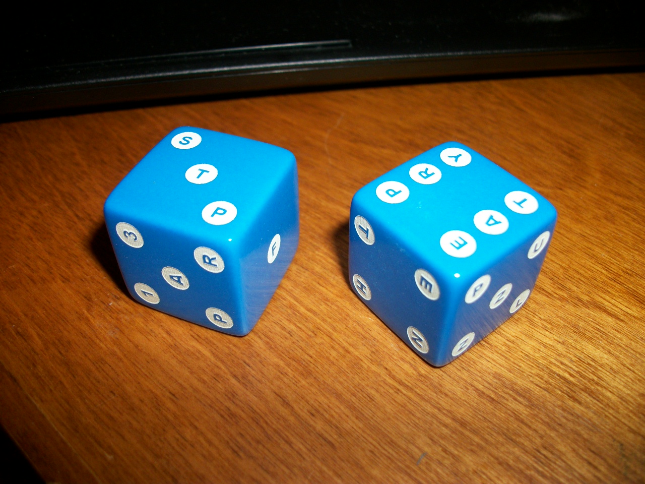 Here's what you're playing for: a pair of custom, 1-inch, lucky (?), commemorative, six-sided dice.