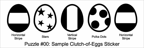 Puzzles will be of a pretty standard format. There will be nearly two dozen of them and teams will get them all up front, after solving the Opening Puzzle (which will take place at kickoff in the park across the street from my house at 10:00 AM). Most of the puzzles will lead teams to locations around Auburn where they will find stickers displaying certain decorated egg icons (a "Clutch-of-Eggs"). Here is a sample Clutch-of-Eggs sticker: