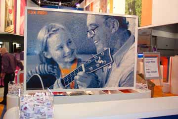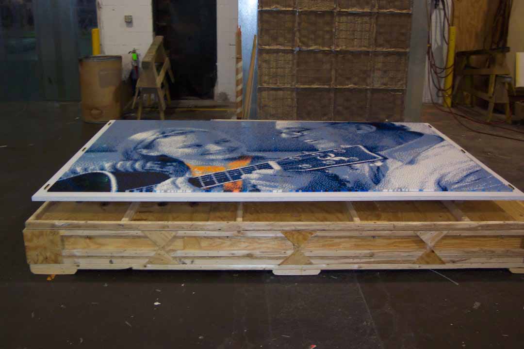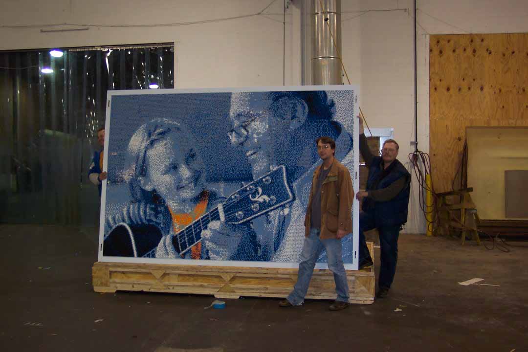 A large mosaic which tied into the theme and slogan for one of the products was agreed upon (the mosaic was a 7' x 10' rendition of an advertisement of a grandfather teaching a granddaughter how to play guitar, it used about 50,000 pieces, including several thousand each of orange, light blue, and gray 1x1s).
