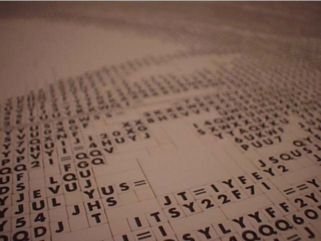 The ASCII Generator program did not care what my supply actually was, so it just used as many of each letter as it deemed necessary. As a result, the output (which was 140 letters wide and 240 letters high) did not come close to matching the letter supply I actually had.