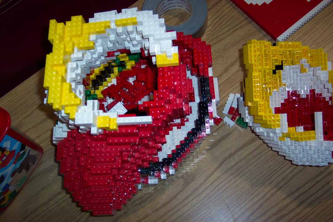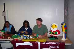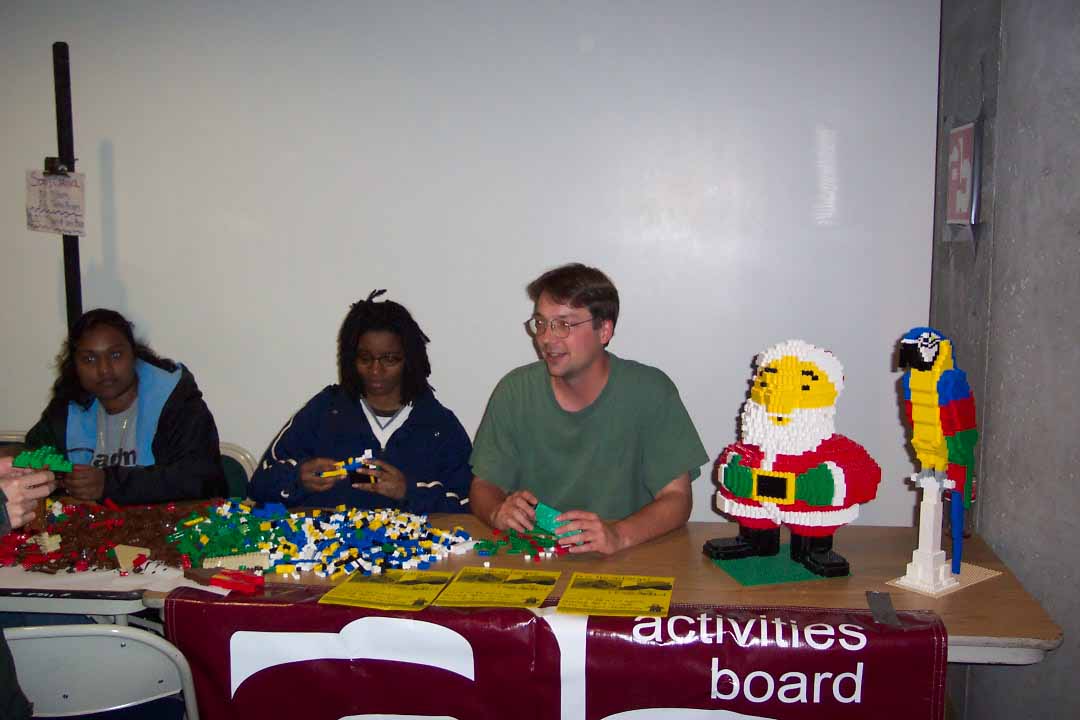 Before the lecture, however, I spent three hours in the student 'commons' area playing with bricks and encouraging students to do likewise (the photo at the top of this page shows Tylesha and I goofing about at the table of bricks). The Activities Board actually provided the buckets of miscellaneous bricks for us to build with. Being a rather last minute expedition, all I brought to display were two small models: my Parrot and Santa Claus. Actually, only the former did I carry on the airplane with me; the latter I shipped.