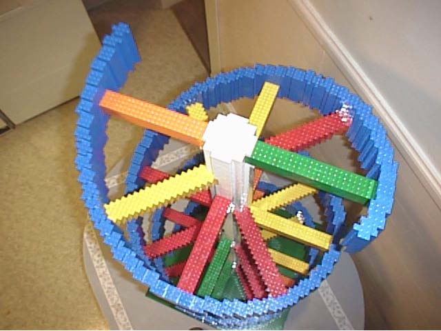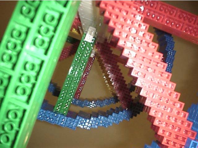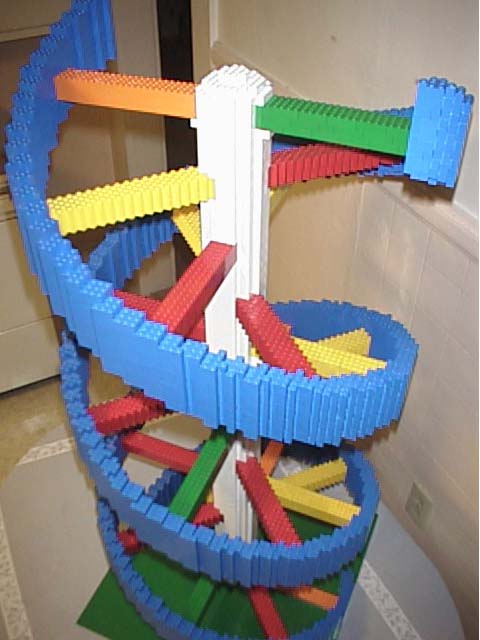The first few curves were novel, but then the repitition set in. The helix has a diameter of 64 LEGO bricks. It is almost four feet tall. The 'blue ribbons' are 3 bricks thick, roughly.