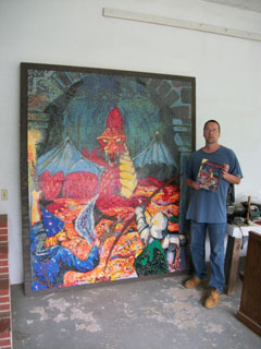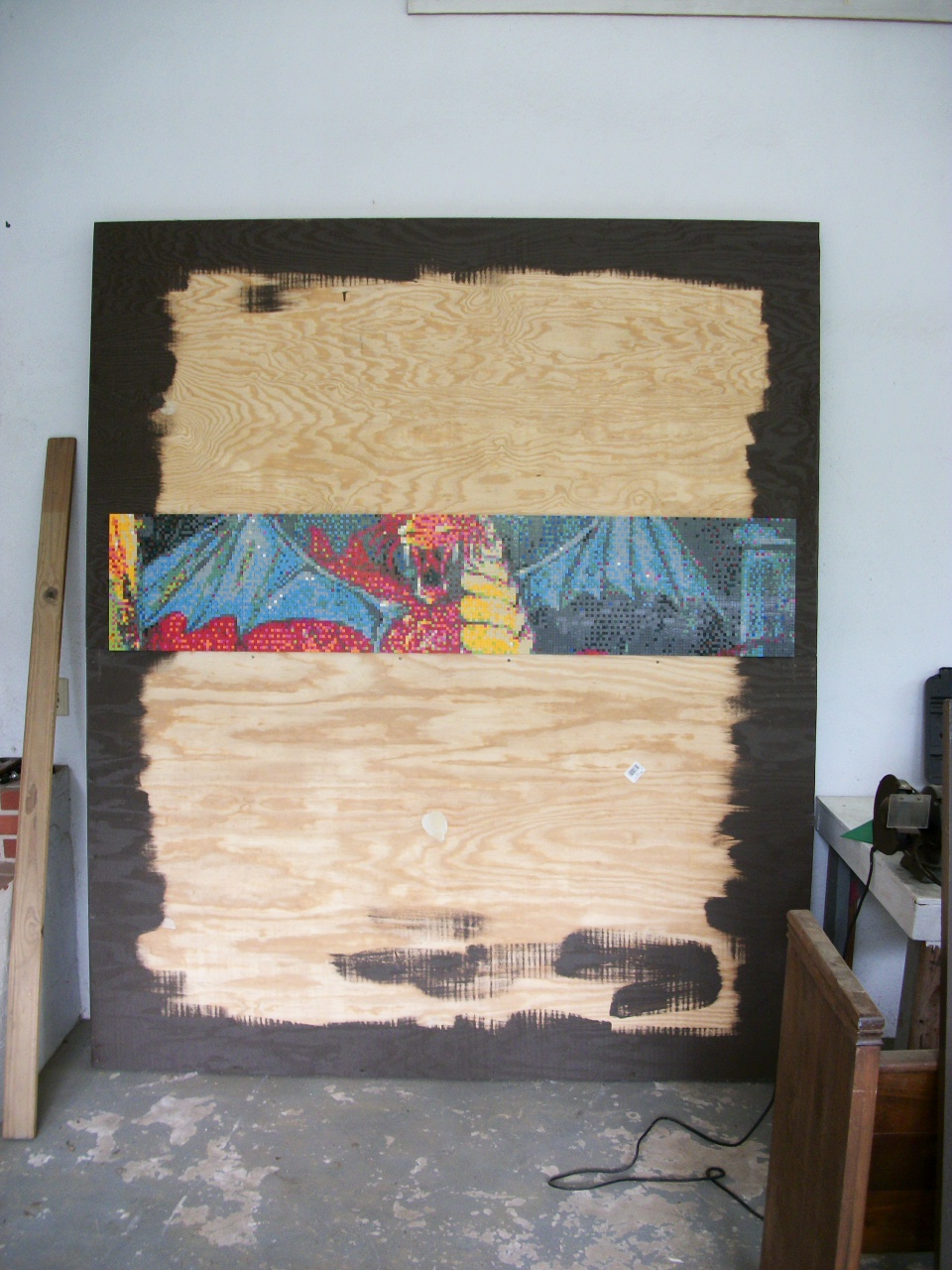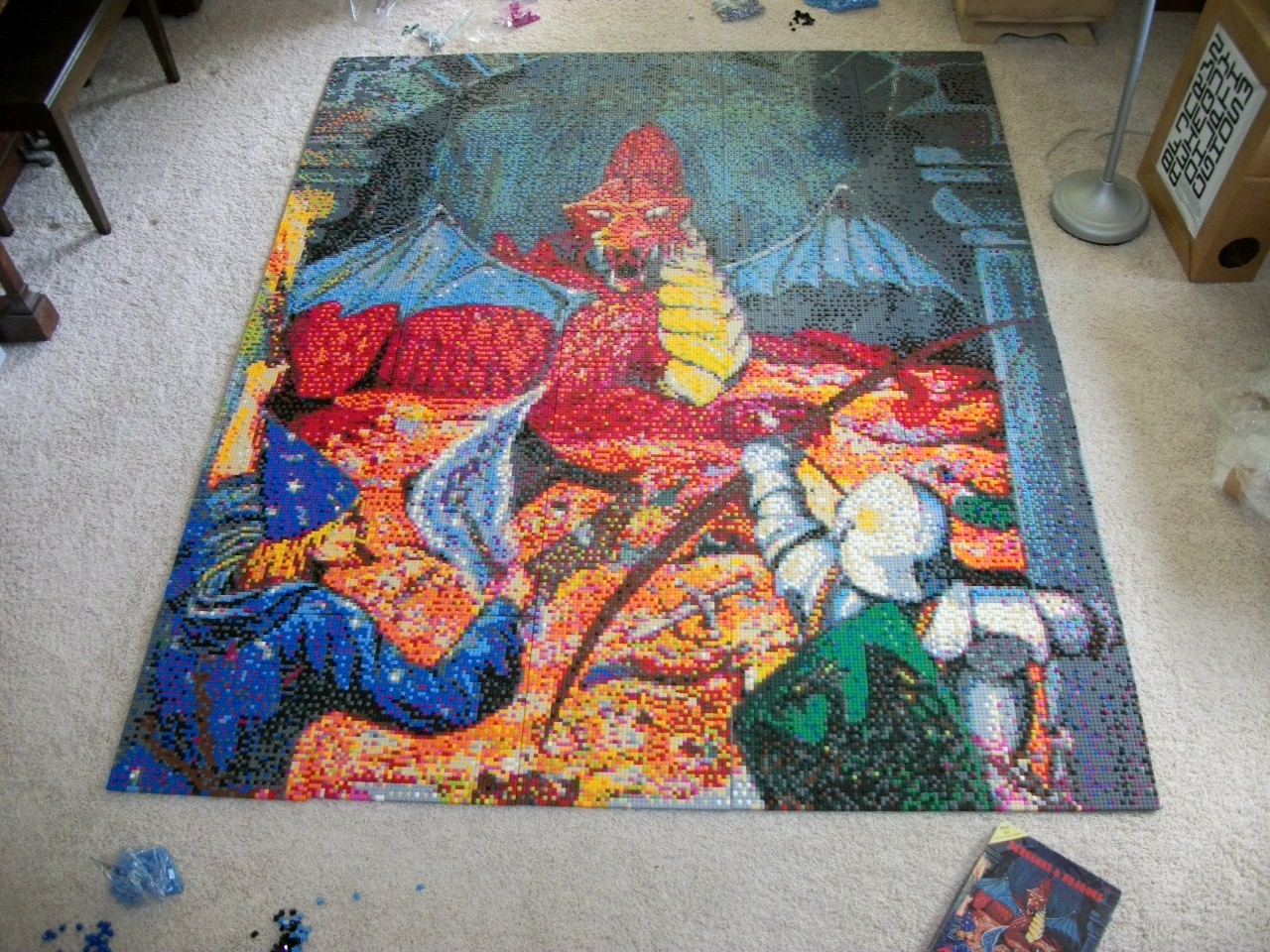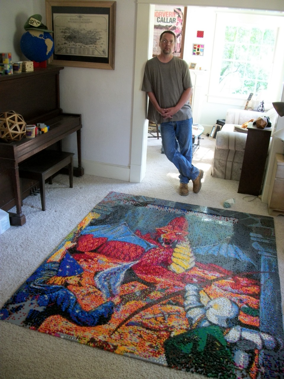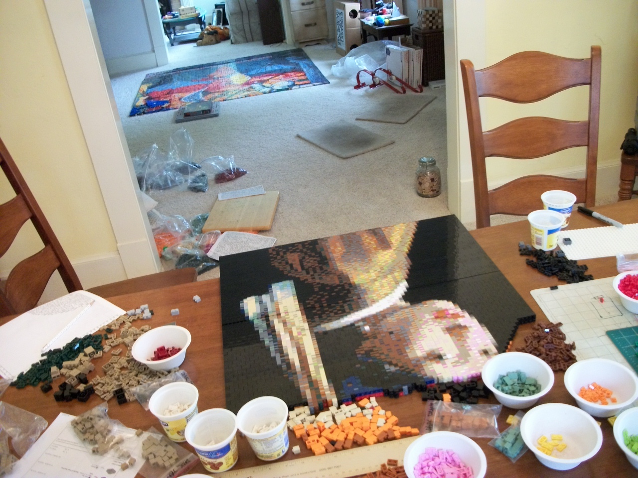 I had been toying with the idea of creating a mosaic of this image for a long time, and when I finally bit the bullet, I decided to GO BIG. The final mural is 75" wide by 90" tall. It uses over 50,000 pieces (clicked onto 30 extra large gray LEGO baseplates). Twenty different colors of bricks are used. This was actually the first personal LEGO project I had worked on in about four years (not since the Samford Hall sculpture). It took me about two months from start to finish (let's not talk about how much the materials actually cost...)