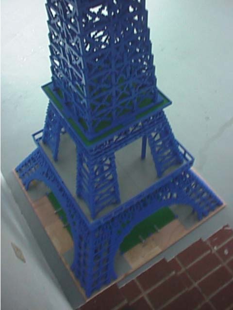 Since this model has to eventually end up on exhibition in Atlanta, I knew I would have to build it in modular sections that would be small enough to be transportable by car or truck. Thus, the bottom two 'tiers' of the tower are build in quadrant sections (see part of tier 1, and part of tier 2). Once the tower narrowed enough, then the sections could be built as single units. In all, twelve modules are assembled to contruct the completed tower.