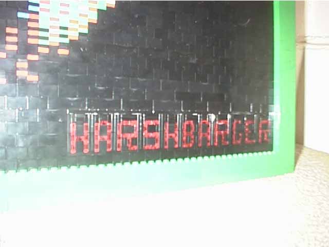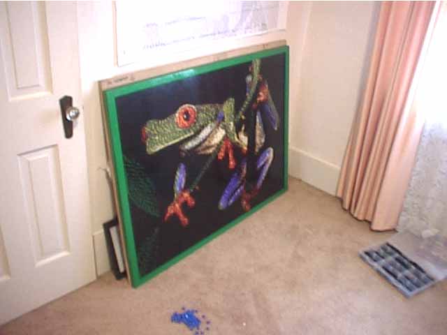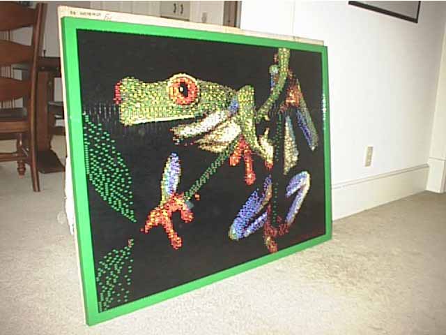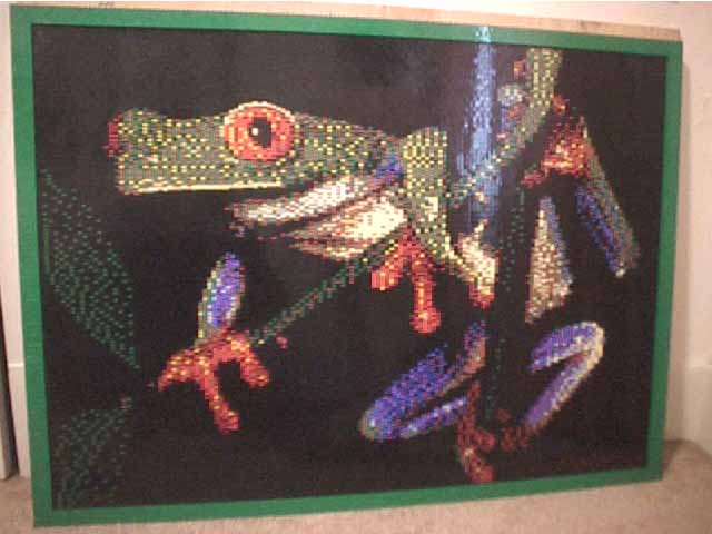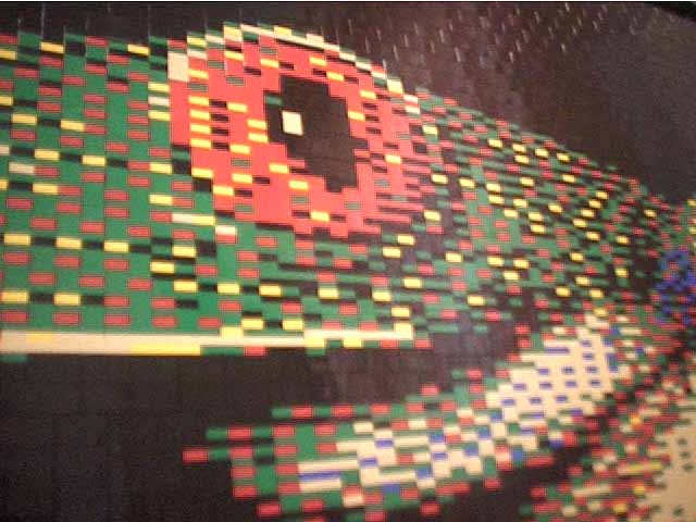 As with all LEGO mosaics, from a distance the colors blend together to form an illusion of varying hues. So while it may appear that several tints of green and blue were used from one distance, closer examination reveals that only 6 colors were needed (black, red, yellow, blue, green, and tan -- no white plates).