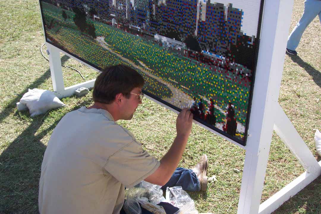 I chose those two colors to prebuild since they were the most used colors. I wanted to make sure I had enough of them in supply, so they were clicked into place a month before the event. White was also chosen since the sky in the mosaic was all of that color (I 'washed out' the color in the original digital image so that it would be all white instead of white with blue speckles). Since the mosaic would be hung panel by panel as they were completed from the top down, getting the baseplates that were mostly white done first allowed me to have almost the complete top row ready to display on the first day of the festival. This is nice so that first day attendees can see that something is actually going on.