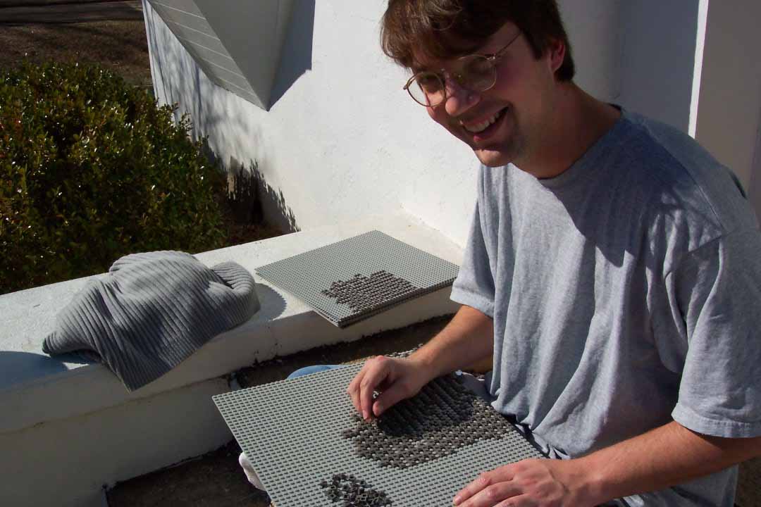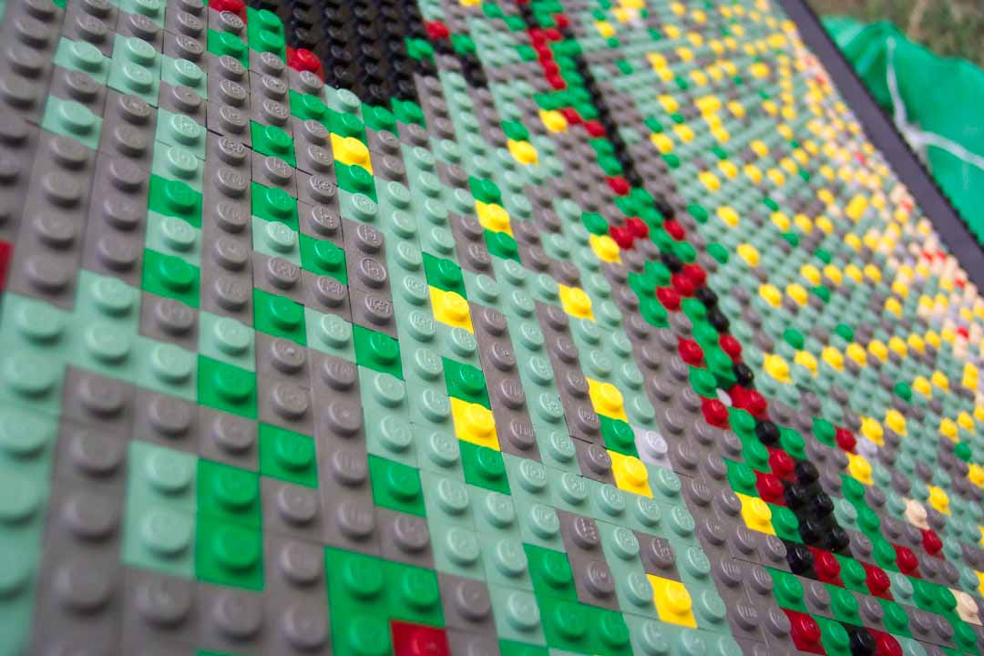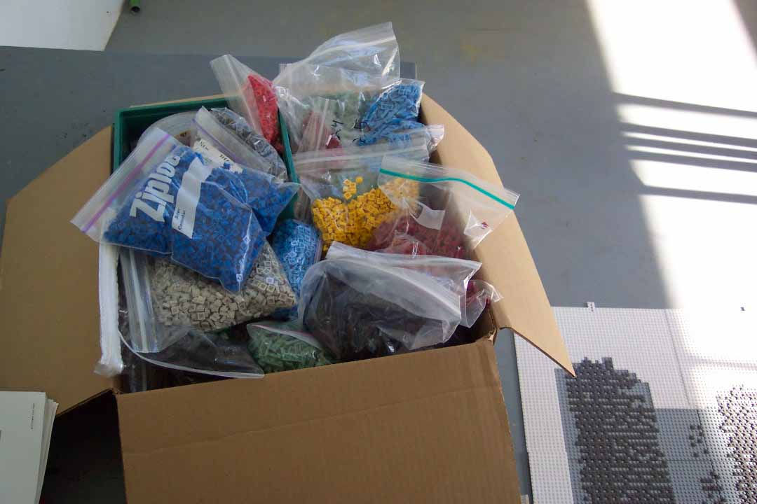 The mosaic itself was built using 13 different colors of plates in 'Studs Out' fashion. This was the most colors I had ever used in a mosaic. I used plates because I happened to have oodles of them in supply. Of the 25,000 or so pieces used (most of them 1x1 plates), the colors were: Black, White, Dark Gray, Medium Gray, Light Gray, Blue, Red, Yellow, Green, Tan, Sand Green, Dark Red, and Light Blue.
