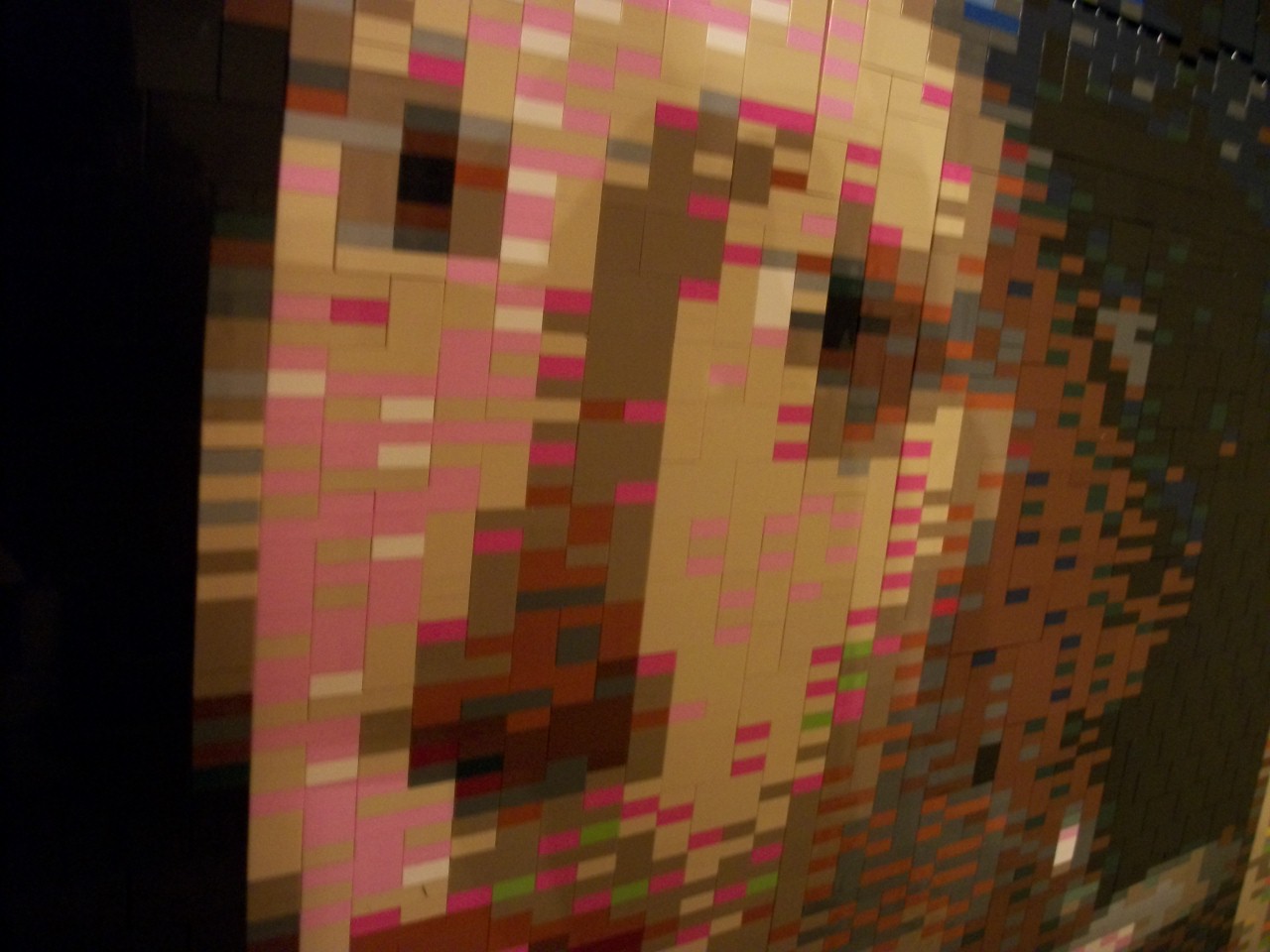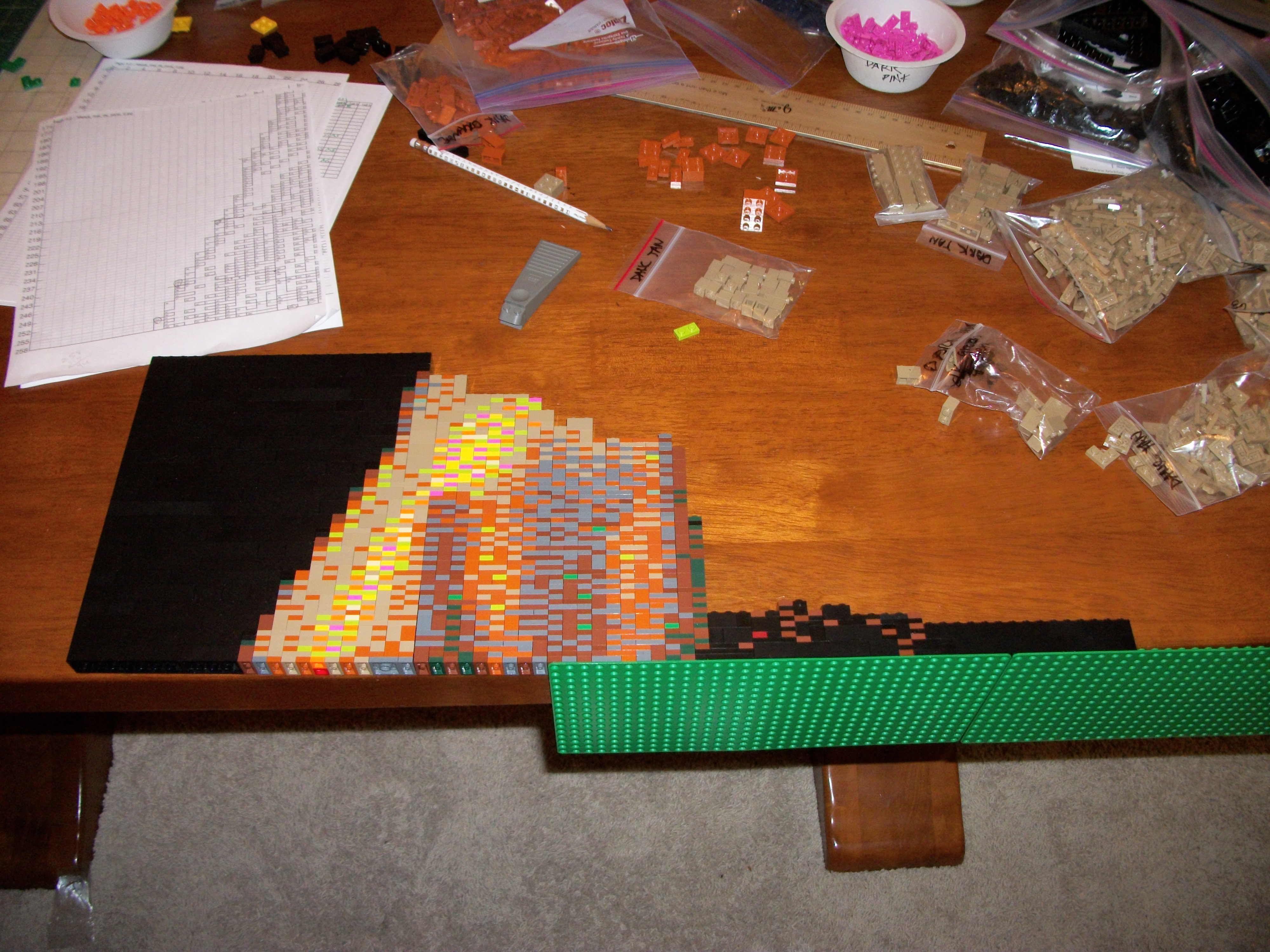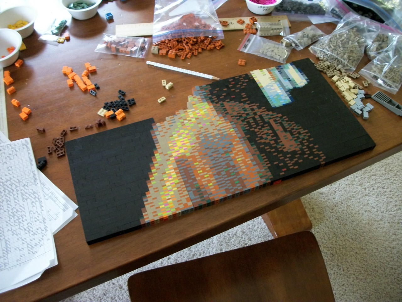 Actually, over the past decade LEGO has produced more and more new colors, so the color palette available for such mosaics has expanded. While the Mona Lisa mosaic used ten different colors, this project used twenty-one (the most colors I have ever used in a single project). It used about 7500 pieces, and is 74 bricks wide (and 262 plates high).