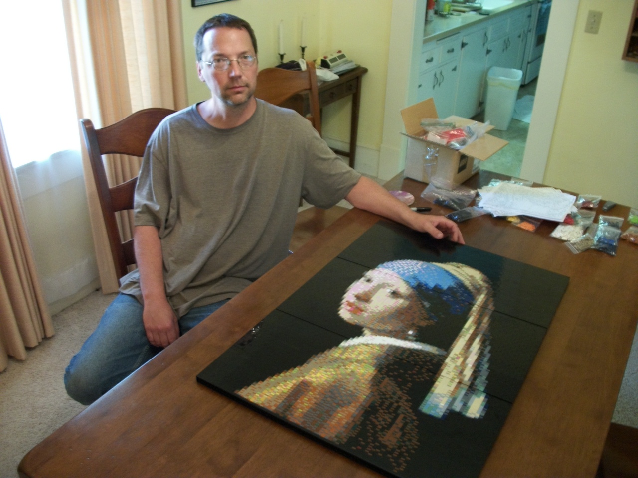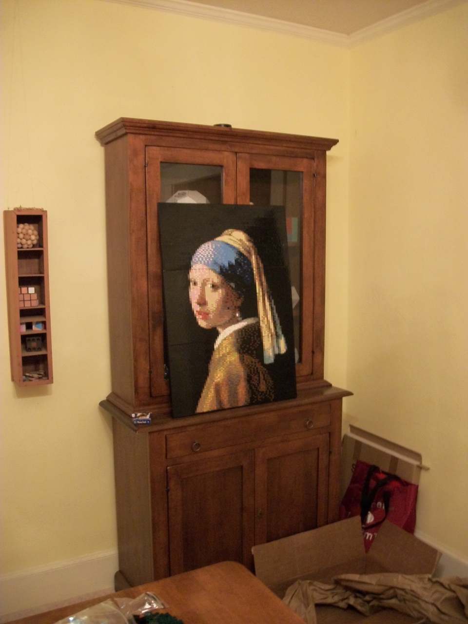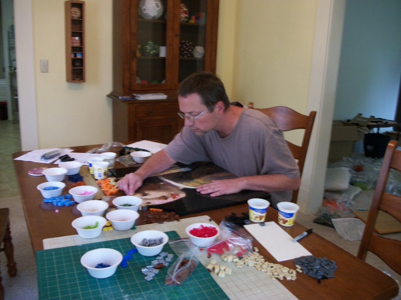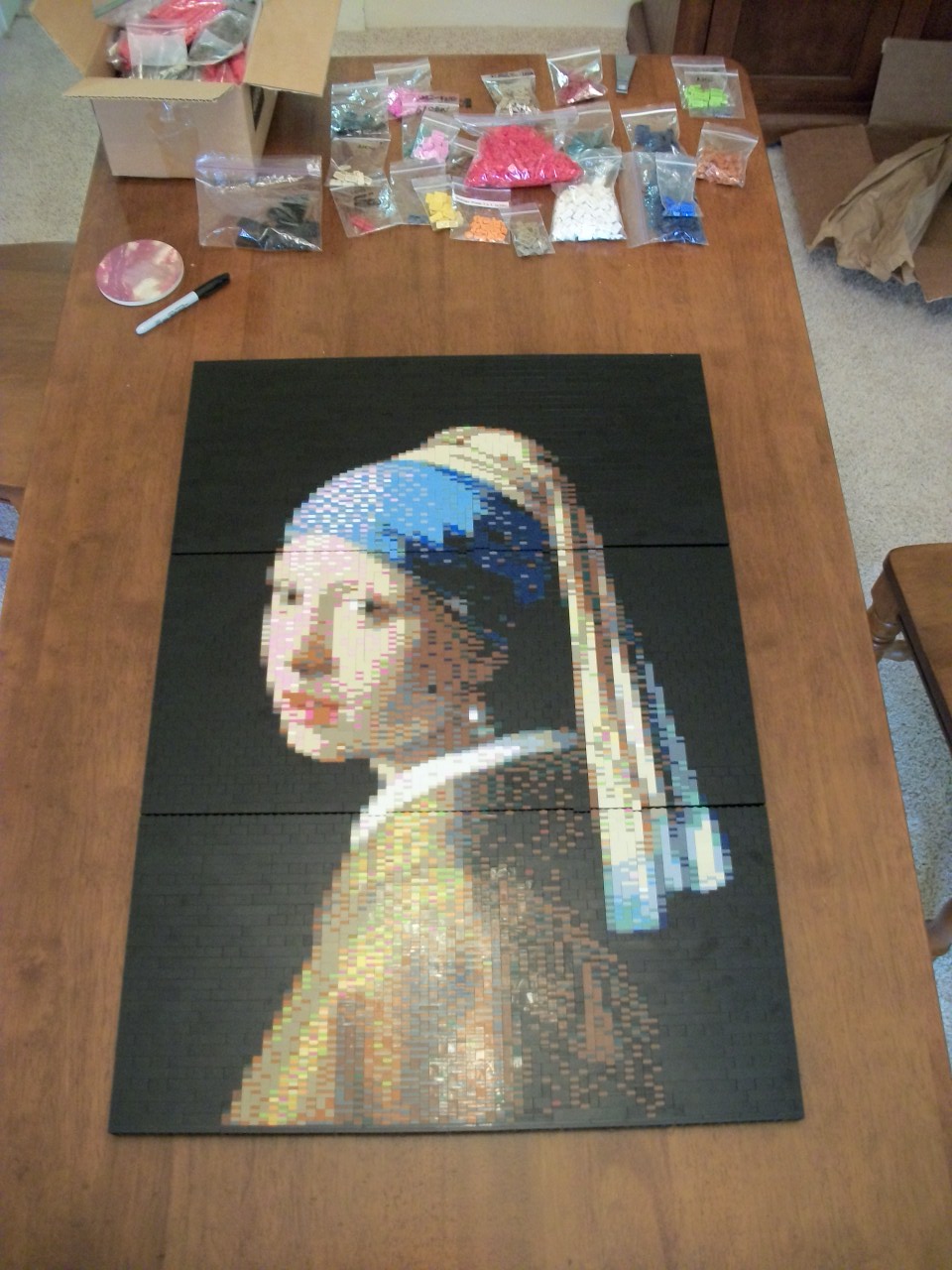 Actually, over the past decade LEGO has produced more and more new colors, so the color palette available for such mosaics has expanded. While the Mona Lisa mosaic used ten different colors, this project used twenty-one (the most colors I have ever used in a single project). It used about 7500 pieces, and is 74 bricks wide (and 262 plates high).
