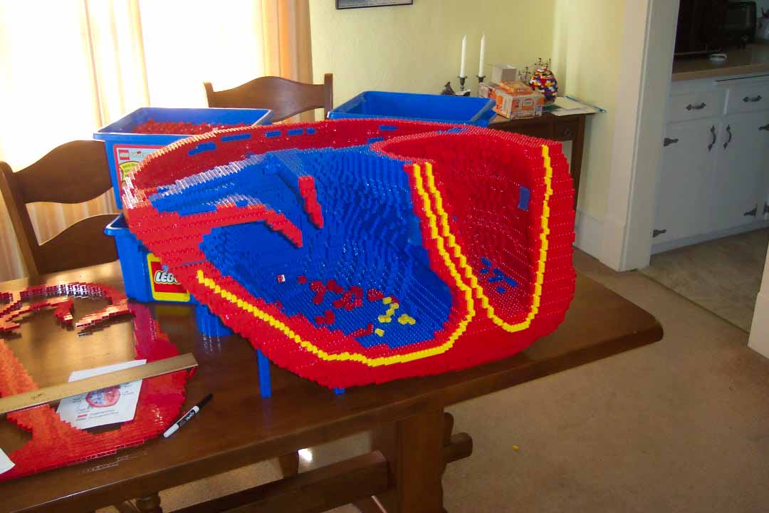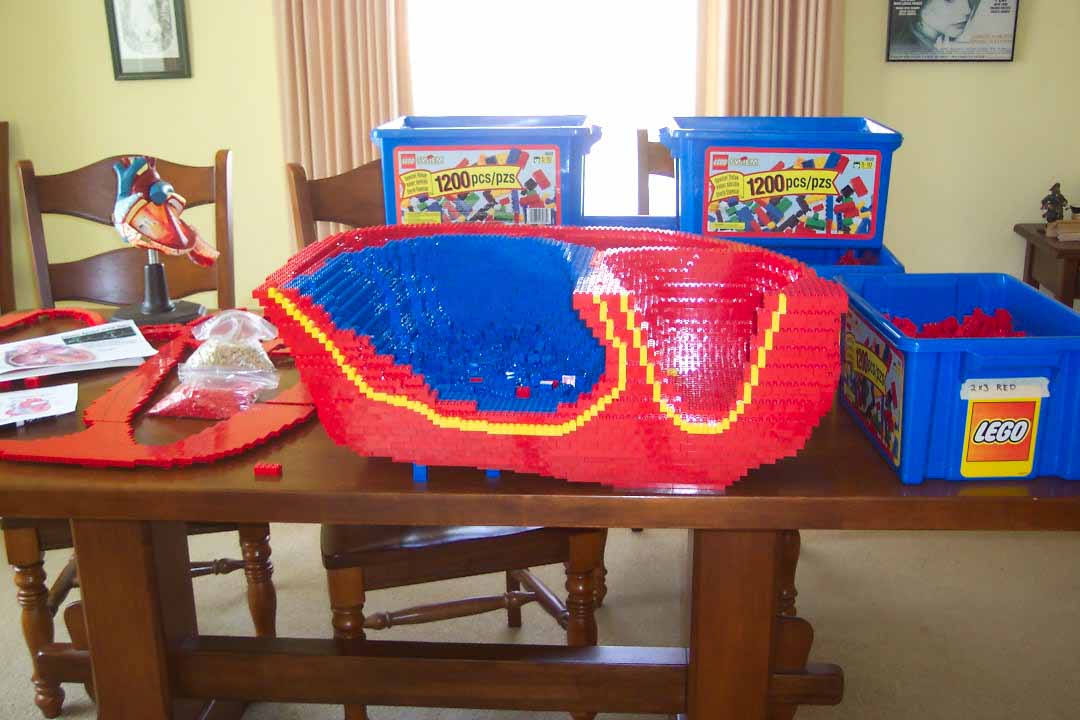 Of course, by the time I had the pieces on hand (tens of thousands of red and blue bricks), the contract signed, and the initial deposit received, I only had about three weeks to build the darn thing (this is the way things typically go in LEGO project negotiations, and why I always tell potential clients that you can never have too much lead time). At four feet tell, the model would be 128 rows of bricks tall. Since I wanted the model done with a week left over to ship it away, I was basically looking at about 8-10 rows of building a day.