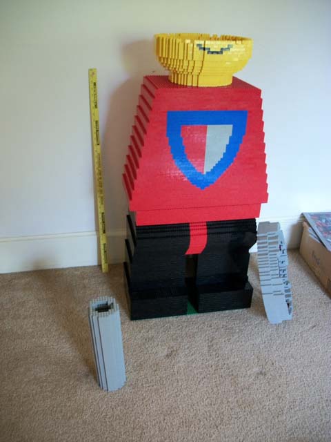 The building was not strenuous at all. The model was fairly symmetric. Only his arms required any free-style sculpture. I had a ruler that measured in increments of 1/64", and with horizontal and vertical conversion rates stored in my calculator's memory, it was not to hard to scale the mini-fig into a mega-fig.