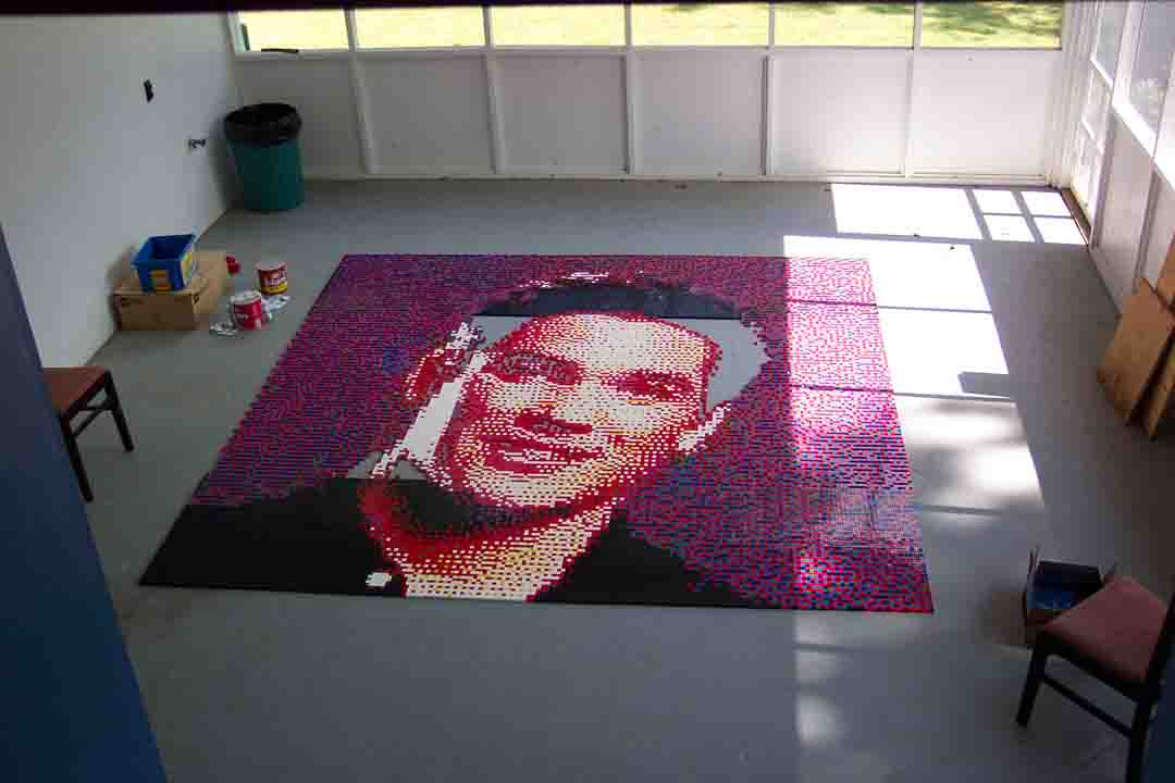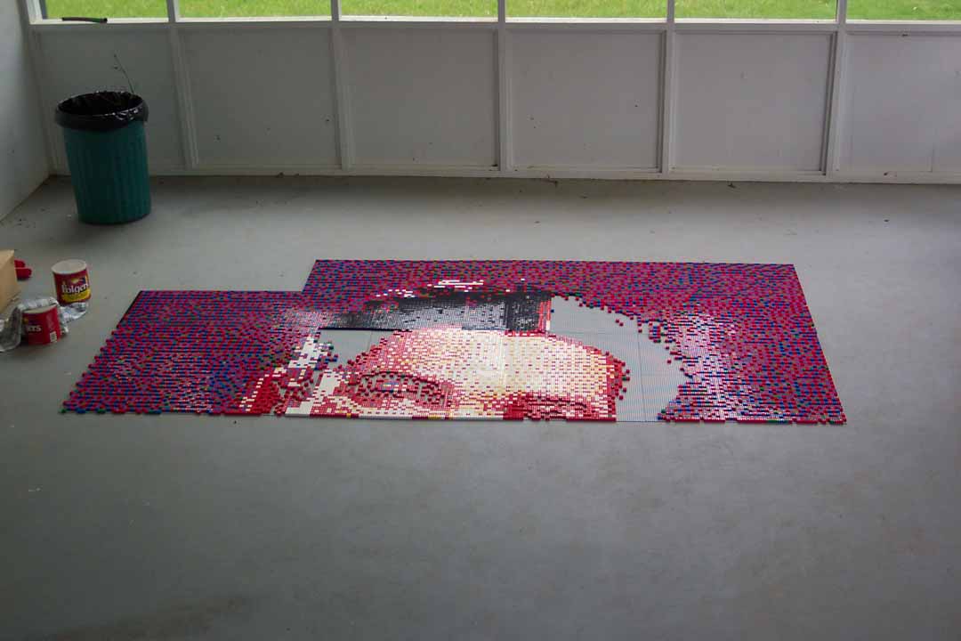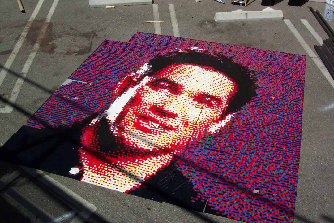 We purposely left 9 of the central baseplate off the billboard so that the identity of the mosaic portrait was not obvious. This was to be a surprise 'reveal' during the taping of the television show.