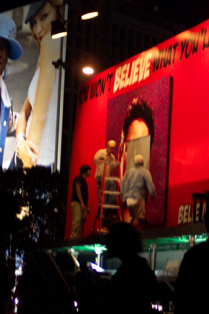 Also, my mosaic was on the left side of the billboard; on the right side were a couple of very muscular body builders who were going to be breaking as many baseball bats over their thighs as possible in one minute (believe it or not!). My understanding was that over the next two days at this billboard they were going to have many more live acts, including guys putting live scorpions in their mouths, a "human syringe" (I didn't ask), and another guy spending 24 hours submerged in a tank of water.