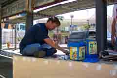 I should, right now, give a big thanks to "Nick" who was a guy present who help out quite a bit with this mounting process. There were 64 baseplates to get up on the board, and by about the tenth one, Nick and I had found a rhythym whereby I would prepare the plates for mounting (by uncovering the predrilled screw holes), and he would actually climb the ladder and put the baseplate in its proper plate. Not once did we accidently mount a baseplate with an incorrect orientation.