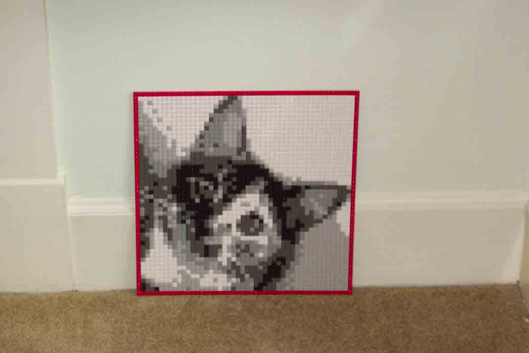 A couple of days before leaving, I got a phone call asking if I could bring about 20 blank baseplates and a small mosaic (built on one baseplate) of some image. Ideas were still being tossed around as to how the script would run, and at some point the above items were thought to be needed. I chose to build a grayscale, 15" square, studs-out, mosaic of one of my cats, Qat (I figured, if there was a chance this thing was going to be on televison, why not try to give one of my cats her 15 minutes fame?)