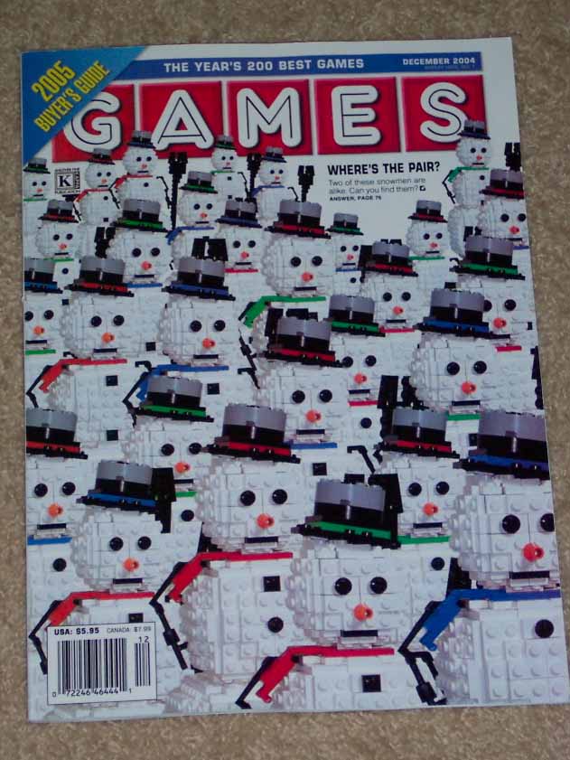 The December 2004 issue of GAMES magazine featured a six page article about me and my career as an independent LEGO builder. In addition to the article, a LEGO snowman that I designed was used on the cover of the magazine to create a puzzle for readers.