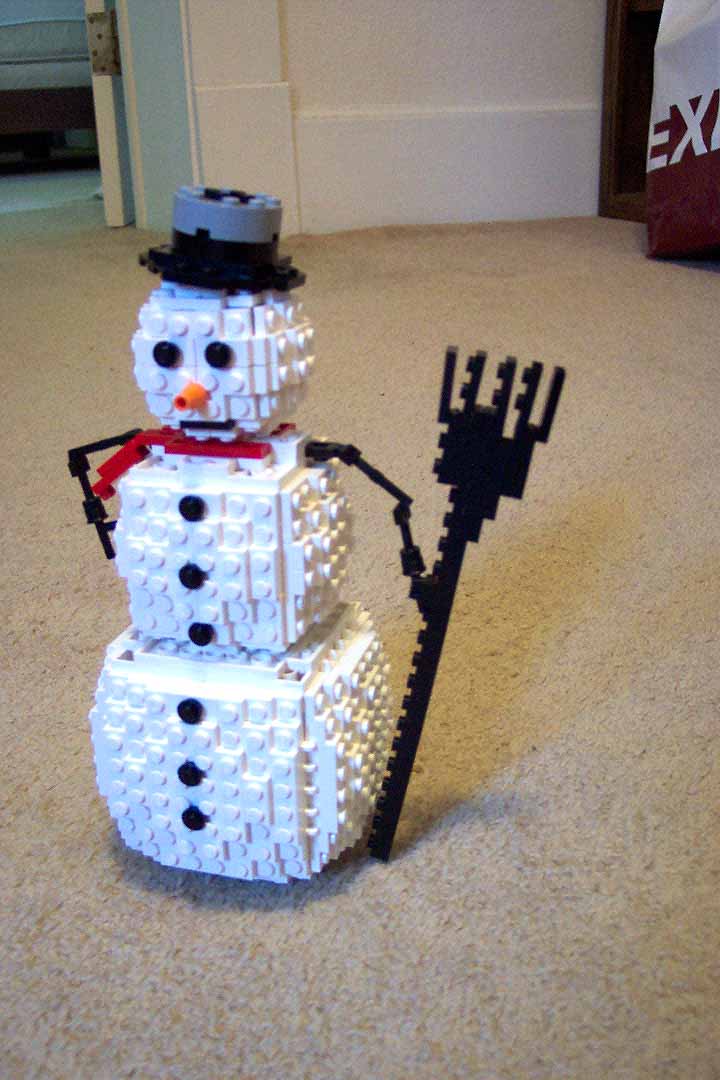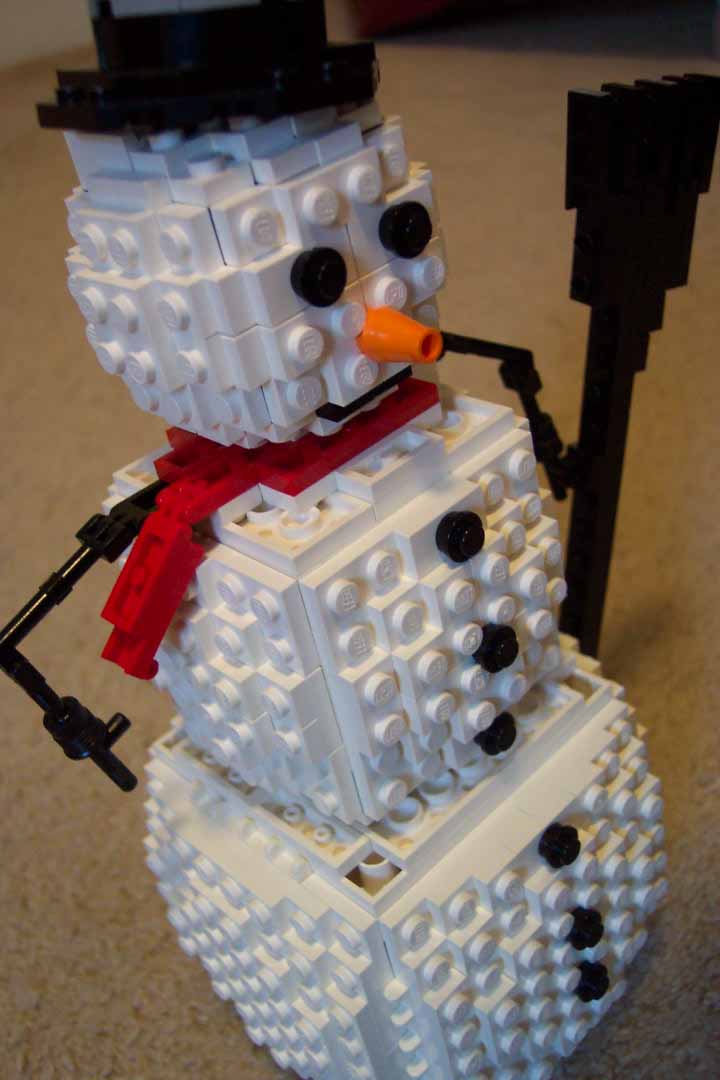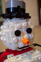 The sphere turned me onto the idea of a LEGO snowman, and so I used Bruce's model as a basis for the head and then extrapolated to larger spheres for the next two sections of the snowman's body (I did have to do some non-trivial modifications to the head to get the eyes, nose, and hinged hat to all stay together without glue).