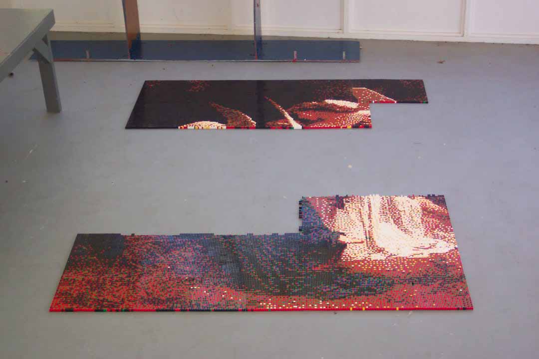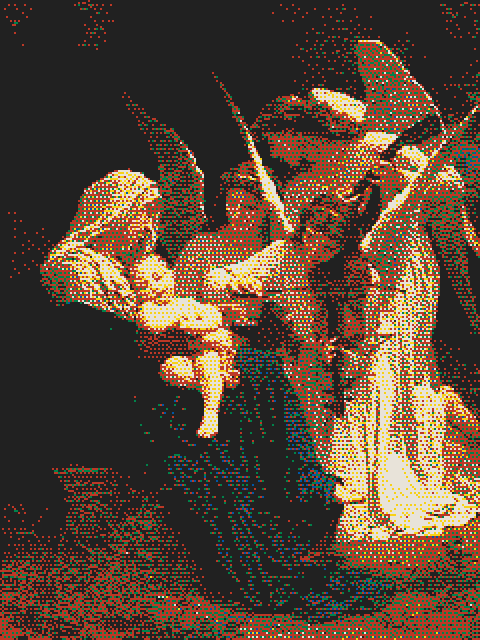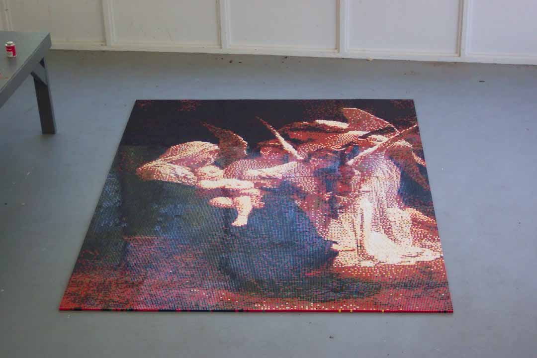 Of all of the potential images we looked at, both myself and the client agreed that Bouguereau's image would be the best. I had to keep the final mosaic under 9 feet tall (wall space constraints), and we decided to use only the 6 basic LEGO colors (black, white, yellow, red, blue, and green). It would have been nice to use brown and tan bricks as well, but since I don't have several thousand 1x1 bricks of those colors just lying about my studio, I didn't want to risk not having the correct inventory (with the basic 6 colors, the only pieces I had to order were about a thousand green 1x1s -- since the mosaic used about 4,000 such bricks -- the rest I had on hand).