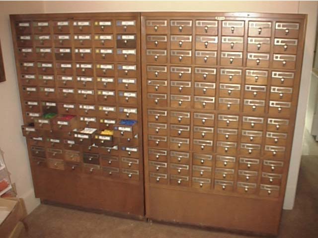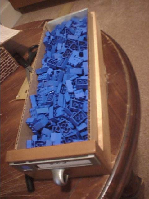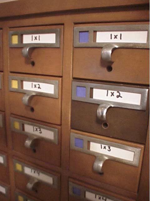 I have yet another solution for storing my LEGO bricks. I have been fortunate enough to come across a number of old card catalog cabinets that were auctioned off at the nearby university (their library file system is all computerized now). These nice, old, oak cabinets each have 72 drawers. I decided that they would be perfect for storing LEGO bricks. The tilt bin set up I had before was nice, but those bins do have their shortcomings (when tilting out there is a tendency for overfilled draws to spill pieces into the bin hole, the bins themselves don't hold a tremendous amount of bricks -- the main size I used held about 1000 1x1 bricks each, and I was a little tired of the cold plastic look and feel of the bins). The recently acquired cabinets looked nicer, and after I cut cardboard sides to heighten the draw walls, each drawer held about 3 times as many bricks as a bin. This amount allowed me to increase my immediate working supply, so all of the blue tubs I had had in my studio room could now be relegated back to more remote storage (namely, out of my studio room and house).