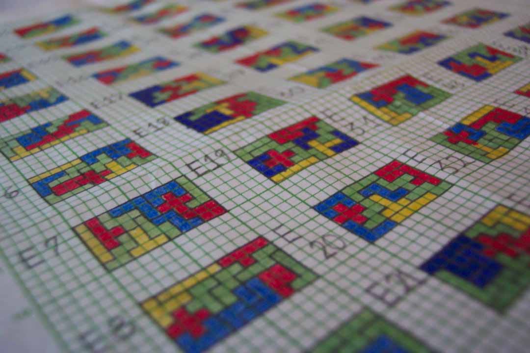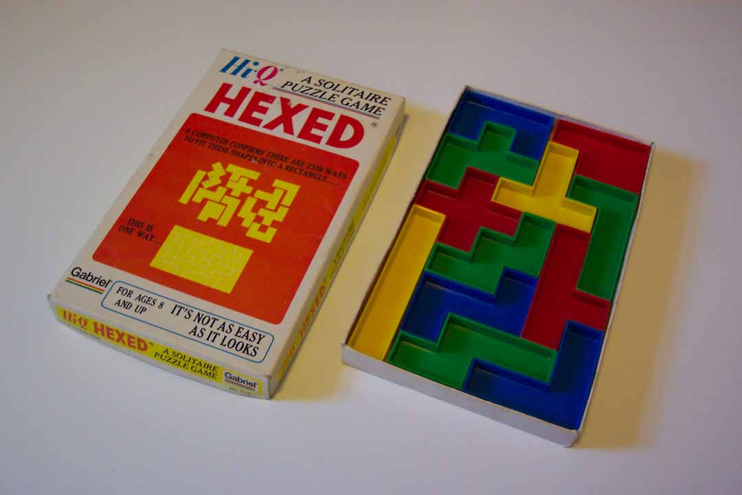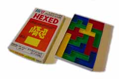 The concept of pentominoes (and their more general cousins: polyominoes -- made from any number of squares joined) have been a part of recreational mathematics for over a hundred years, but it was the 1965 book Polyominoes by American Professor Solomon W. Golomb which formally defined the shapes and made a rigorous, documented study of them. I received my first set of pentominoes when I was about 9 years old (it was sold by the company Gabriel under the named Hexed -- pictured, right). The lid of the box proclaimed that there were 2339 ways to fit the pieces in the box (a 6x10 rectangle). Boy, was I determined to find all of them. Even at that young age, I was pretty focused. I played with those pentominoes often, and each time I found a solution, I would record it on a sheet of graph paper using colored pens (after having checked against the previous solutions).
