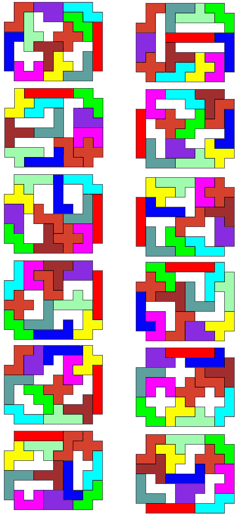 I do not know whether quartets or quintets of other shaped pieces may be enclosed. And I conjecture that no sextet of pieces can be enclosed. - Eric Harshbarger, 2 Jan 2005 Update (14 Jan 2005): Michael Keller and Aad van de Wetering both attacked my triplet question above and within a day of each other sent me emails. The former's included the following kind words: It's too bad there isn't an annual award for best new pentomino problem. Eric Harshbarger would be my nominee for 2005, even though the year has just begun...