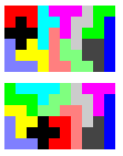 One will note that in this solution three of the pieces, the T-, W-, and Z- pentominoes, do not touch the edge of the the 6x10 box; they are properly in the interior of the figure. I refer to these pieces as being "landlocked". I began thinking about this landlocked property, and wondered how the other 2338 solutions compared to this one. Were there any solutions with 4 landlocked pieces? Even 5? and how about at the other extreme: were there any solutions which had only 1 landlocked piece? Or even any with no landlocked pieces whatsoever? I posed this question to a fellow whom I knew to be a pentomino enthusiast. A short time later this person, Tom Saxton of Idle Loop software answered my question. After some computer analysis on his part, he provided the following information: there are no 6x10 solutions with 5 or more landlocked pieces. Below that number the breakdown is as follows: LL # of SOLUTIONS -- -------------- 4 207 3 1111 2 864 1 155And, to my surprise, there were some solutions that have NO landlocked pieces, but only a couple. Here is the image Tom sent to me: