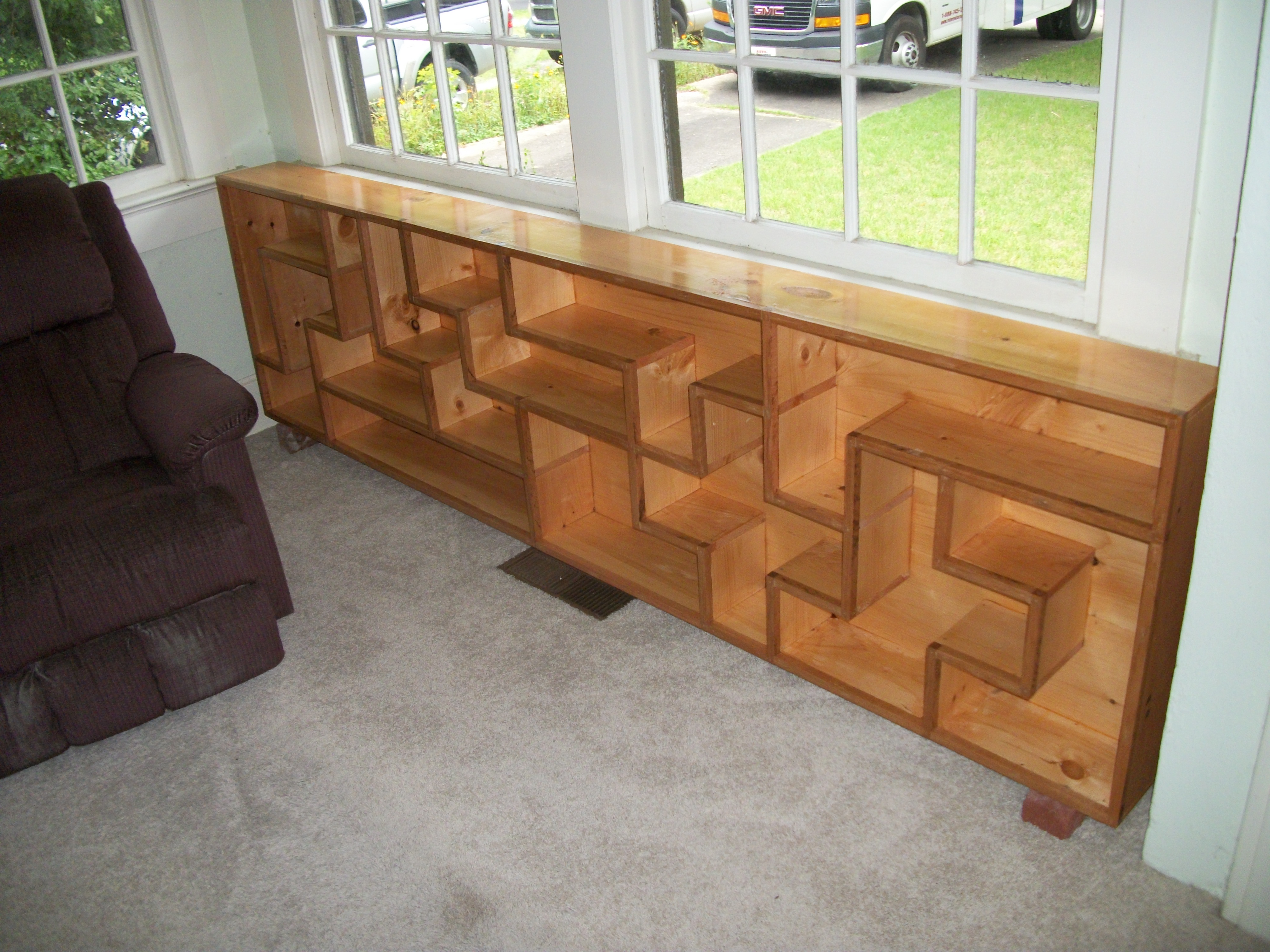 I ended up going with a 4×15 rectangle and having each square cell measure 7 inches (before having to account for the thickness of the boards). The final cabinet measured 105.75" wide and 28.75" tall, which filled the blank area of the wall exactly as I desired. Here are a couple of pictures of the shelves taken immediately after I set them up: