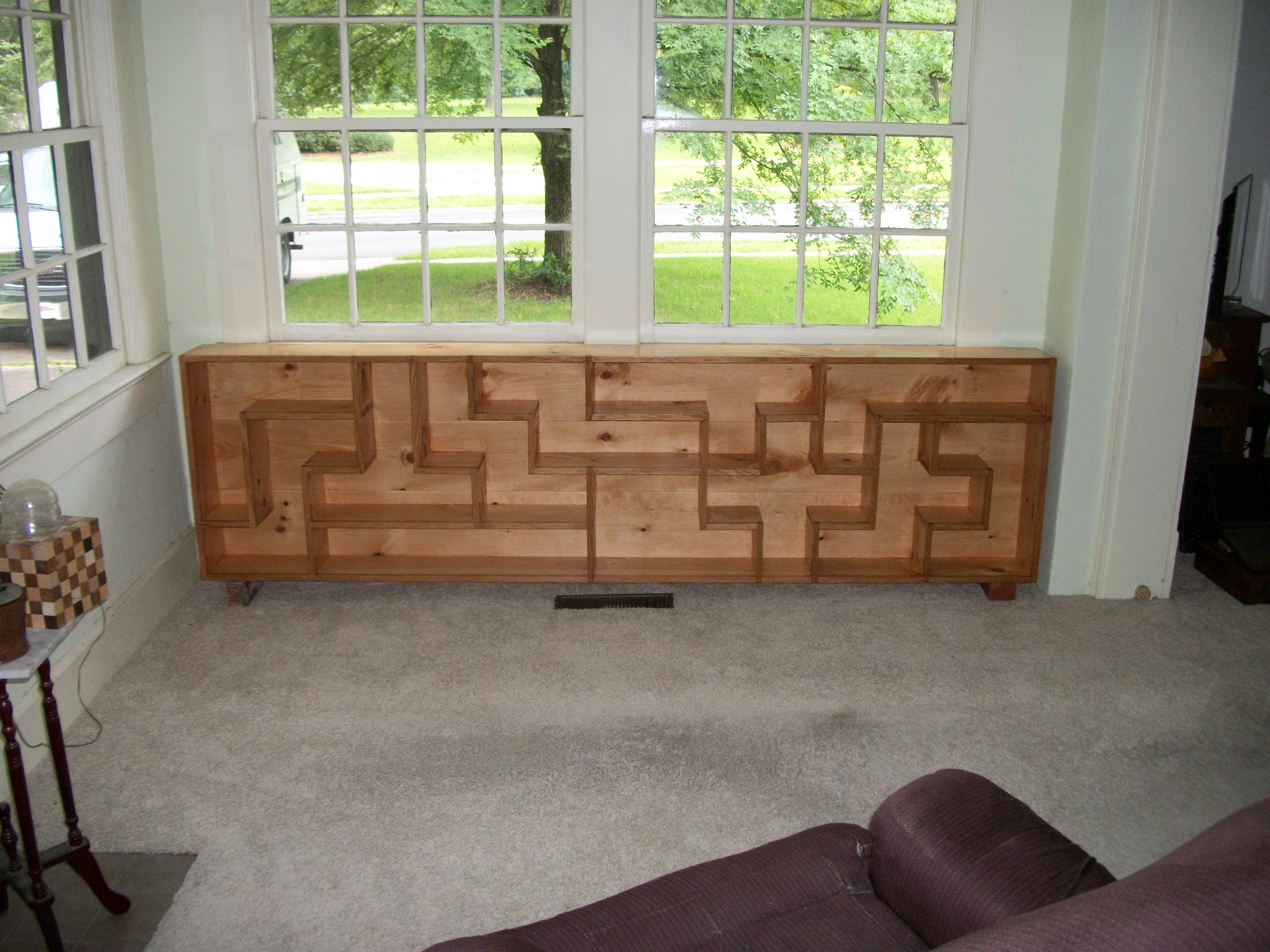I wanted a set of shelves to display some of my puzzles and geometric models on, and I wanted the cabinet to span pretty much the whole length of one wall (with the top surface coming in just below the windows of the south wall). Having four possible rectangle sizes to choose from allowed me to use a height/width ratio that fit my needs perfectly.