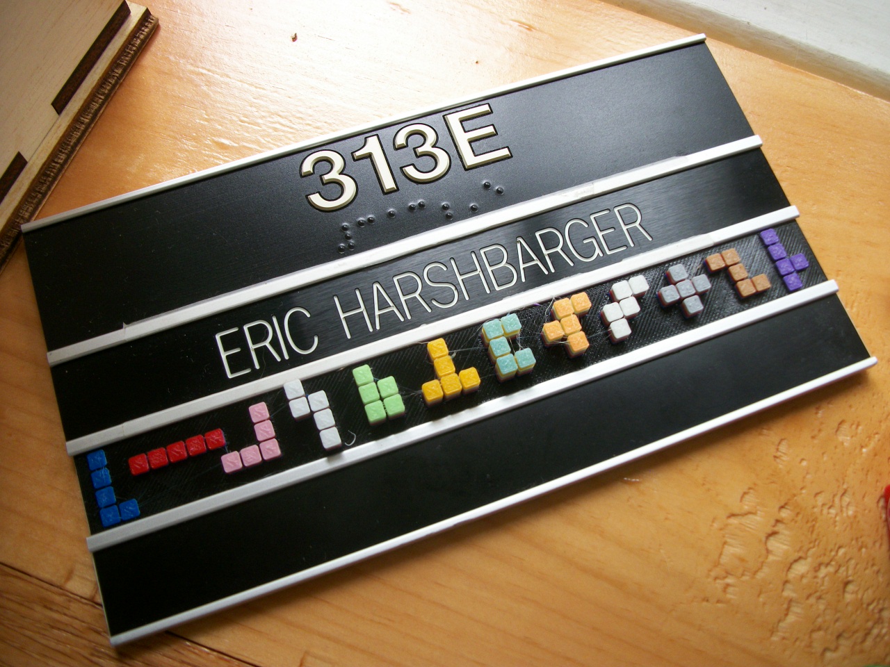 In yet another example of me adorning various accoutrements in my life with my twelve favorite shapes, today I spruced up the nameplate outside my office down: