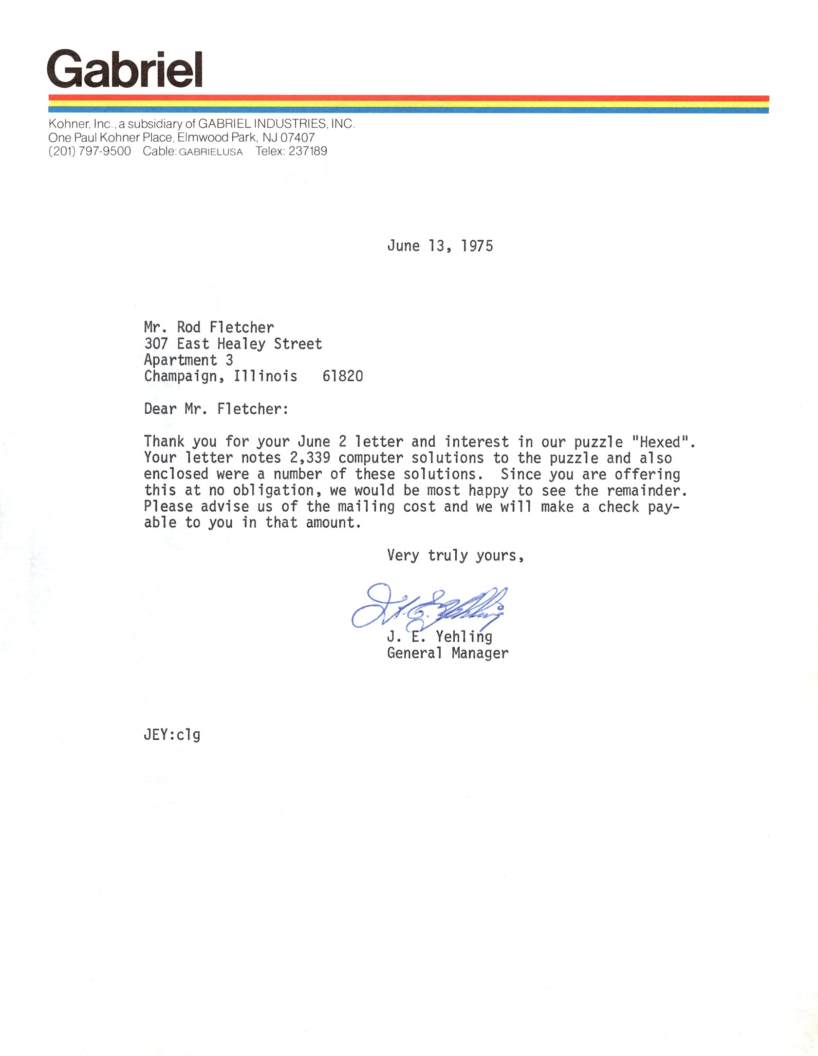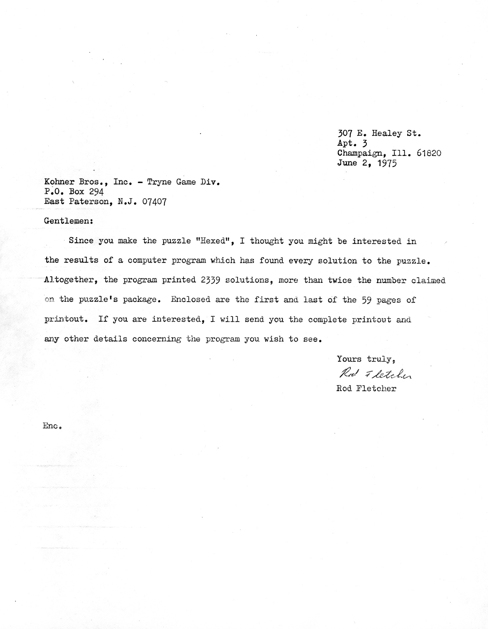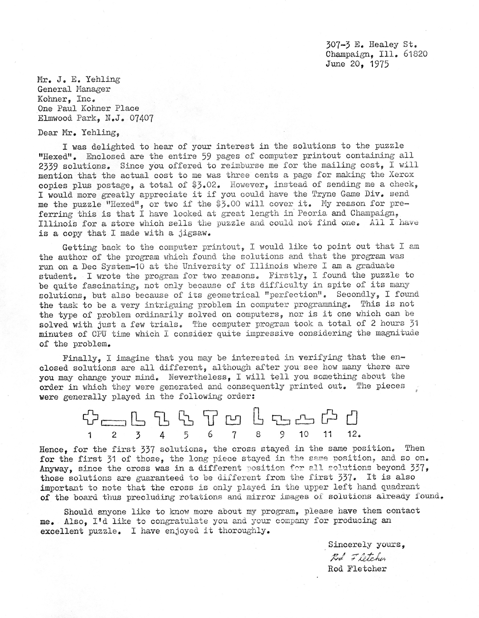 About Those 2339 Solutions...On the introduction page of my pentominoes website I mention the very first set of pentominoes I ever owned: a toy called "Hexed" produced by the Gabriel toy company. I got this puzzle sometime in the early 80s and I was immediately entranced by the fact that the lid of the box stated that there were exactly 2339 different ways to fit the twelve pieces into the box (which formed a 6x10 rectangle). The exact text read, "A Computer Confirms There Are 2339 Ways To Fit These Shapes Into A [6x10] Rectangle."Recently I was contacted by an individual, Rod Fletcher, who was one person who calculated that 2339 number. He might have been the first individual to figure out how many distinct 6x10 rectangular configurations there were, and he subsequently notified the Gabriel toy company of the calculation. He still has copies of the correspondence to prove it. During the 70s Mr. Fletcher was a graduate student in electrical engineering at the University of Illinois. In April of 1975 he wrote the solving program on a Dec System 10 computer ("a roomful of racks with lots of blinking lights," as he put it). The program was written in the Macro-10 Assembly Language, and for every five solutions it found it printed out another row of diagrams (here is a scan of the first forty solutions found as sent to me by Rod -- note that the diagrams are depicted using 1s and underscore characters...). Several hours later (after using "2 hours 31 minutes of CPU time" and fifty-nine printed pages), all 2339 solutions were found. Mr. Fletcher shrunk these pages down on a photocopier and mailed them to Kohner Bros., Inc (a subsidiary of Gabriel Toy Industries) as seen in this scan of that correspondence. He received a reply (on Gabriel letterhead) on 13 June of that year, thanking him for the information. His follow-up letter goes into more detail about his motivations for writing the program as well as an argument as to how the 2339 solutions can be verified as distinct and exhaustive. In lieu of any financial reimbursement, Mr. Fletcher simply asked that some copies of the puzzle be sent to him. By the time those copies of the puzzles were received, the puzzle's packaging had been updated to include the "2339" number on the lid. This was the edition of the puzzle I eventually owned. There many reasons why I was thrilled to be contacted by Mr. Fletcher. Obviously, this was an account that I could strongly relate to. I still own that original puzzle and the box it came in, and as a child I always wondered how a computer could count up the solutions (these days, after a lifetime of writing programs myself, I have a much better idea of how that was accomplished). It's also a chance to appreciate the advancements in computer power during the past fifty years (as if we aren't often reminded of that already). Back in 1975 it took Mr. Fletcher's program just over two and a half hours to compile all of the 6x10 pentomino solutions. Today, using a copy of Burr Tools, that roomful of blinks lights is replaced by a fancy graphical user interface that can analyze polyform puzzles of all types of shapes and configurations. It can also find all 2339 6x10 pentomino solutions in about 4 seconds' time. But beyond the topic of pentominoes, Mr. Fletcher's correspondence with me about all of this reminded me of a "simpler time" with the World Wide Web. A time when people (often geeky programmers on some level) would search the web for esoteric topics, and maybe, just maybe, they would find someone out there who had written information about such topics. "Personal webpages" are harder and harder to find these days on the web. The few that seem to remain from the late 90s and early 00s are so easily drowned out by the social networks, news aggregate websites, pop-up cookie warnings, advertisements, and AI-written-generic miasma that dominate the internet. Too often I feel like there may no longer actually be any "information" on the Web, just pages of links that refer to other links, but no one actually linking to real "content" (can the reader tell how disenchanted I've become with the industry that treated me so well decades ago?). I still have my personal webpages (written in rough HTML, by hand, using 'vi' text editor). I don't update them very much these days. Many of the links no longer work. But occasionally, every now and then, somebody out there stumbles across them and finds someting of interest. And that can lead to an enlightening correspondence. Mr. Fletcher's emails to me were one such correspondence, and I'm glad to have learned a bit more about the history of one of my favorite puzzles.