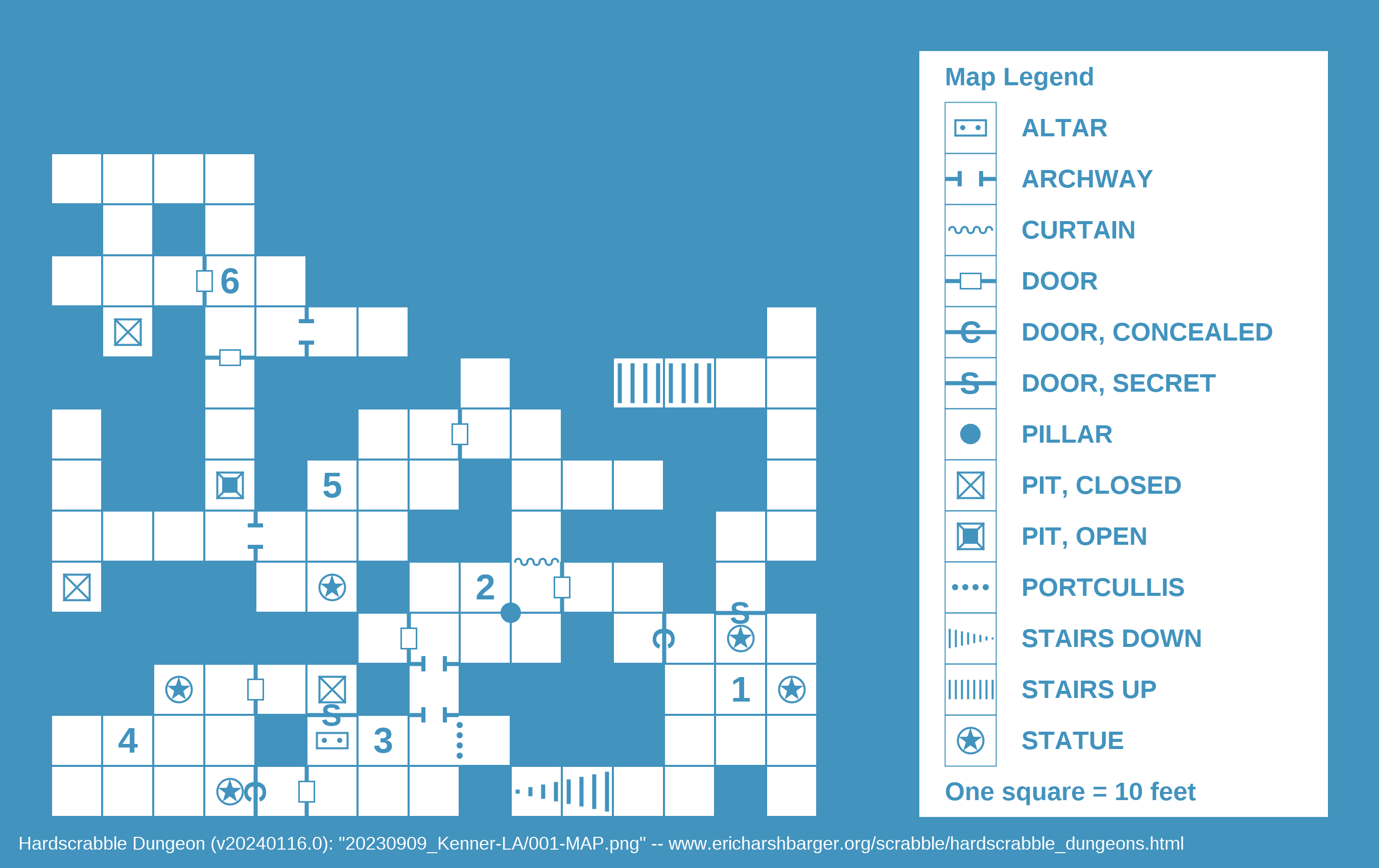 - 20231005: Added "room numbers" to the rooms. Rooms are enumerated in ascending order based upon the travel distance away from the "stairs down" point.